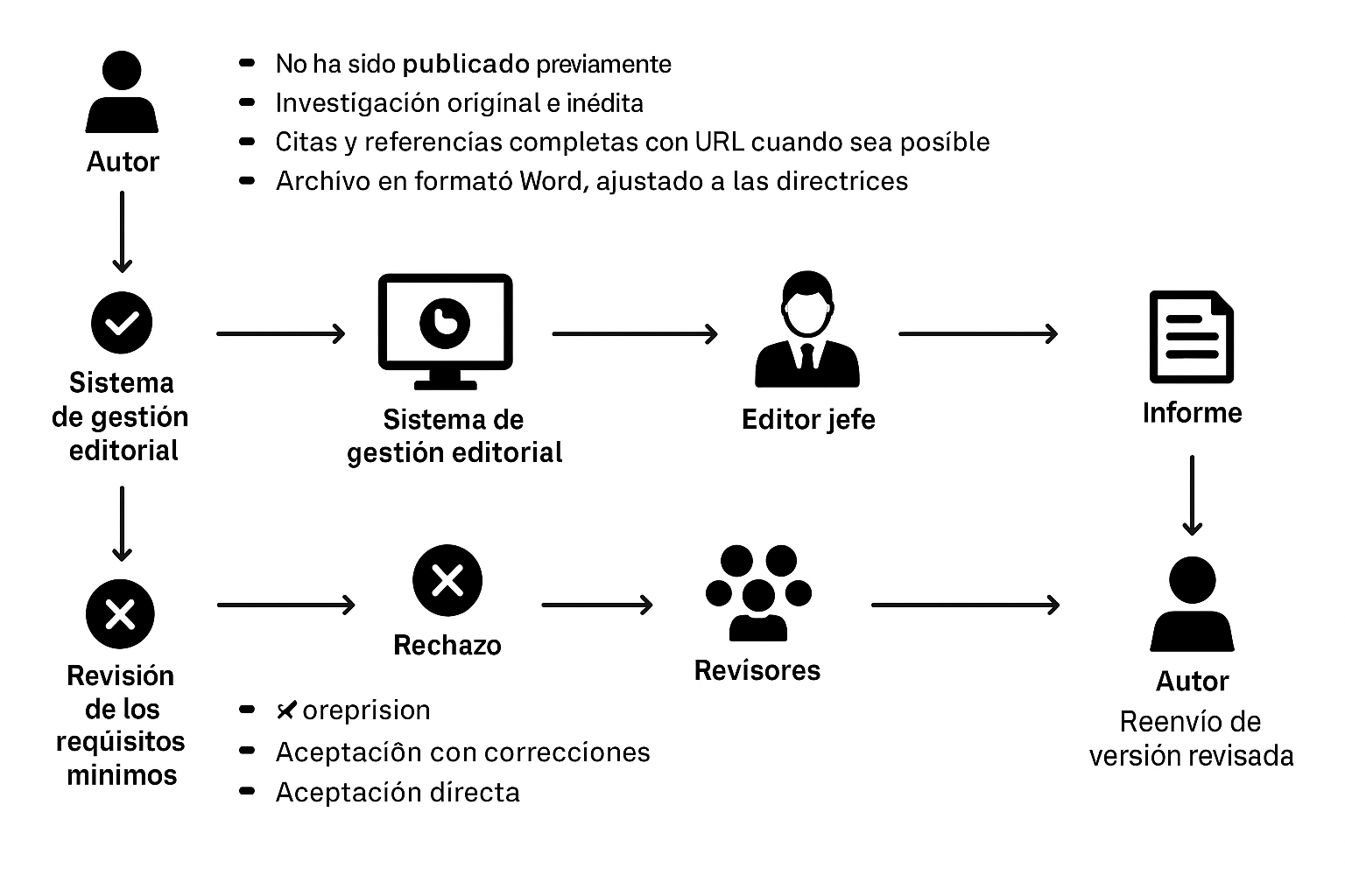Tras el envío, el Comité Editorial realizará una revisión preliminar para verificar que el trabajo cumpla con el enfoque, alcance y directrices de la revista, así como con los requisitos mínimos de calidad en redacción y contenido. Los manuscritos que no cumplan estos criterios, presenten faltas éticas o tengan documentación incompleta, podrán ser rechazados sin pasar al proceso de revisión por pares. El tiempo estimado de esta revisión es de una a dos semanas.